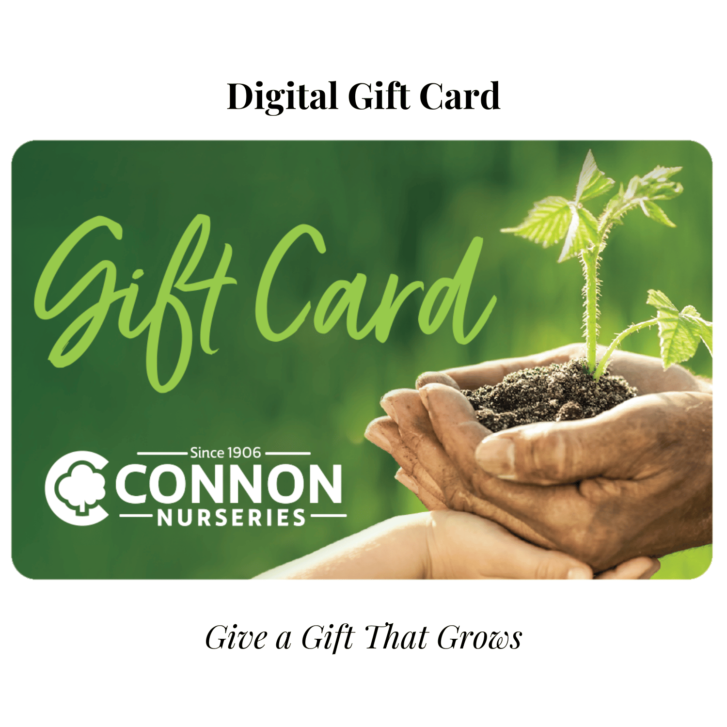 Your digital gift card can be used at all participating locations, excluding online purchases. Connon Nurseries cannot be held responsible for lost, stolen or misused cards. Cards cannot be redeemed for cash, except when required by law. This card does not expire and no dormancy fees will be charged, The use of this card constitutes acceptance of these terms and conditions.